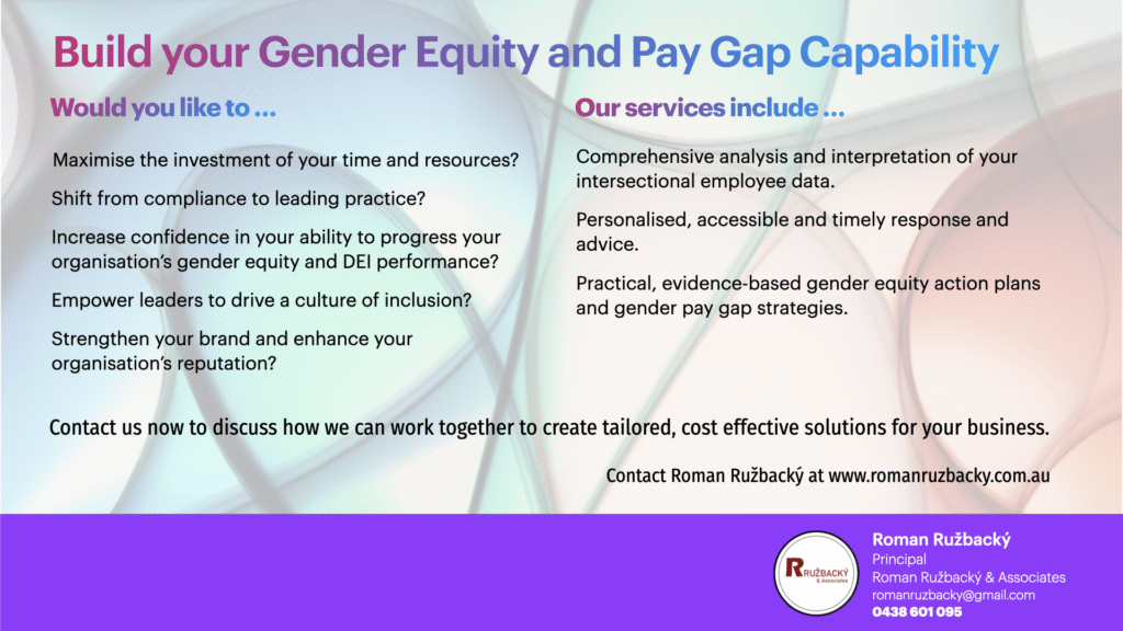 Advice on WGEA Compliance and Employer of Choice for Gender Equality and the design and implementation gender equity strategies to achieve Employer of Choice, and an increased in the representation of women in senior positions and a reduction in the organisation’s pay gap.